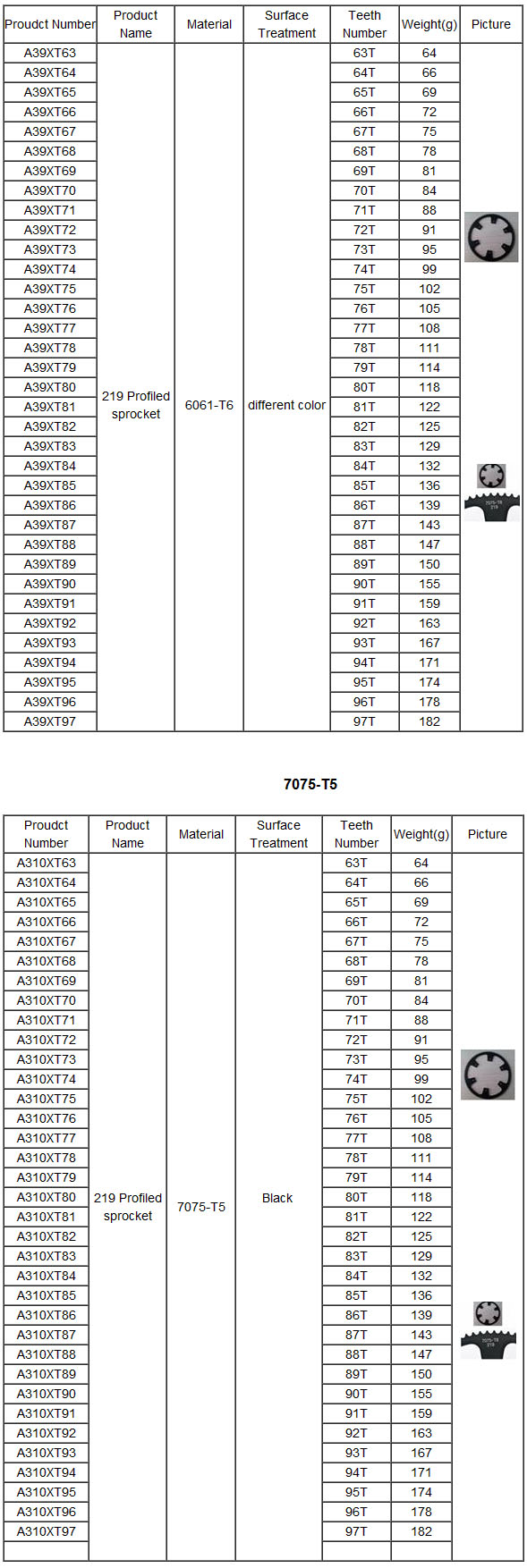 219 Profiled sprocket Material:6061-T6,7075-T6,anodized different color,black. Sprockets are sized by the chain pitch and the number ofteeth. The more teeth, the larger the sprocket is. The larger the sprocket, the better your low-end power will be. The smaller the sprocket, the better your top-end speed will be. However, small sprockets really punish the already weak low-end torque of the kart. For this reason some use torque converters. If you expect great performance from a smaller engine, they are a must. For a single wheel drive, the sprocket can mount directly to the wheel so that there are no moving axle parts. A chain and sprocket is a good and popular choice for the drive assembly, as they will wear better than a pulley system, are simple to install, and inexpensive.