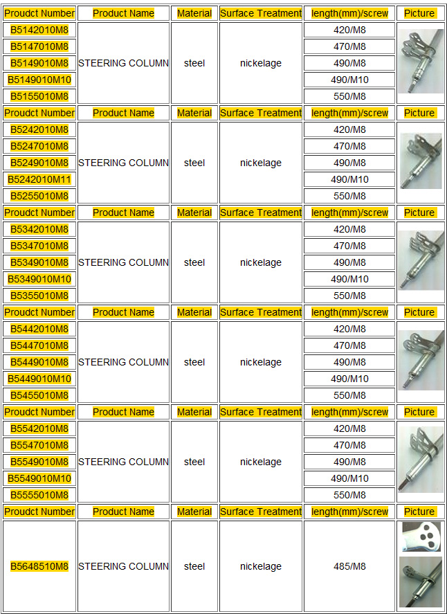 STEERING COLUMN Our main products are: Racing go kart parts,CNC machining parts,transmission parts,and other OEM parts. About go kart parts ,we produce GO KART GEARING PARTS, ALLOY SPROCKET,CONTROL PARTS, PEDAL SETS, FRONT AXLE,STUB AXLE,REAR WHEEL,BEARINGS,SUPPORT PARTS,CLAMP,BRAKING PARTS,WHEEL HUB,SPROCKET CARRIER,DISC CARRIER,METALS PARTS, ALUMINUM WASHER,NUT,TOOLINGS. Relying on its good credibility and excellent services, Brunowins high prestige among the customers at home and abroad. We has established steady business relationships with companies from more than 25 countries,and has maintained long-term cooperation with more than 200 overseas customers,with over 20 of which Bruno China has built a strategic partnershipof coordination.As the guiding principle,Bruno gathers a professional foreign trade team, builds up its own production bases, and forms a large network of supply sources. We are here to make those steps easier for you!