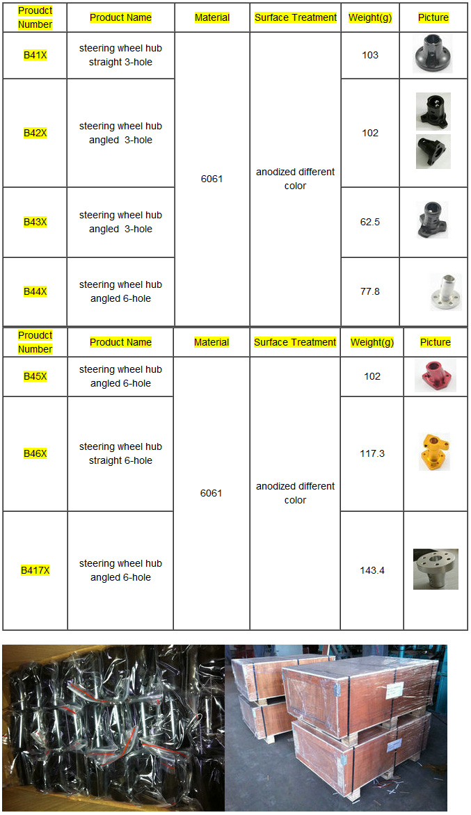 Steering wheel hub Material:6061,anodized different color. Our main products are: Racing go kart parts, CNC machining parts, transmission parts, and other OEM parts.