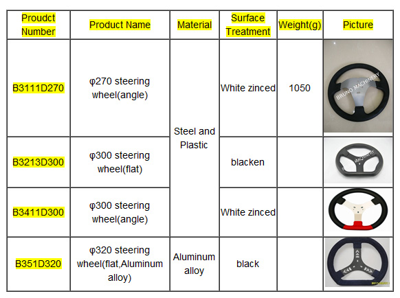 ¦Õ270steering wheel(angle),¦Õ300 steering wheel(flat),¦Õ300 steering wheel(angle),¦Õ320 steering wheel(flat,Aluminum alloy). Our main products are: Racing go kart parts, CNC machining parts, transmission parts, and other OEM parts. About go kart parts, we produce GO KART GEARING PARTS, ALLOY SPROCKET,CONTROL PARTS, PEDAL SETS, FRONT AXLE,STUB AXLE,REAR WHEEL,BEARINGS,SUPPORT PARTS,CLAMP,BRAKING PARTS,WHEEL HUB,SPROCKET CARRIER,DISC CARRIER,METALS PARTS, ALUMINUM WASHER,NUT,TOOLINGS. Relying on its good credibility and excellent services, Bruno wins high prestige among the customers at home and abroad. We has established steady business relationships with companies from more than 25 countries, and has maintained long-term cooperation with more than 200 overseas customers, with over 20 of which Bruno China has built a strategic partnership of coordination. As the guiding principle, Bruno gathers a professional foreign trade team, builds up its own production bases, and forms a large network of supply sources. We are here to make those steps easier for you!
