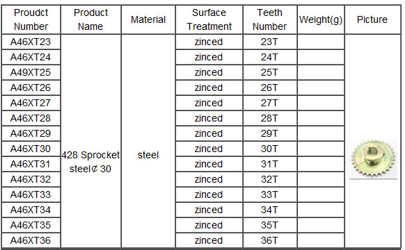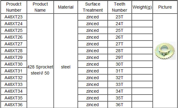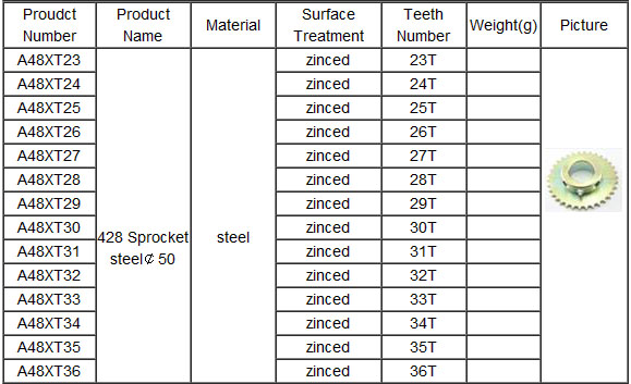 428 Sprocket Steel,¡é30,¡é40,¡é50,zinced. Sprockets are sized by the chain pitch and the number ofteeth. The more teeth, the larger the sprocket is. The larger the sprocket, the better your low-end power will be. Thesmaller the sprocket, the better your top-end speed will be. However, small sprockets really punish the already weak low-end torque of the kart. For this reason some use torque converters. If you expect great performance from a smaller engine, they are a must. For a single wheel drive, the sprocket can mount directly to the wheel so that there are no moving axle parts. A chain and sprocket is a good and popular choice for the drive assembly, as they will wear better than a pulley system, are simple to install, and inexpensive.